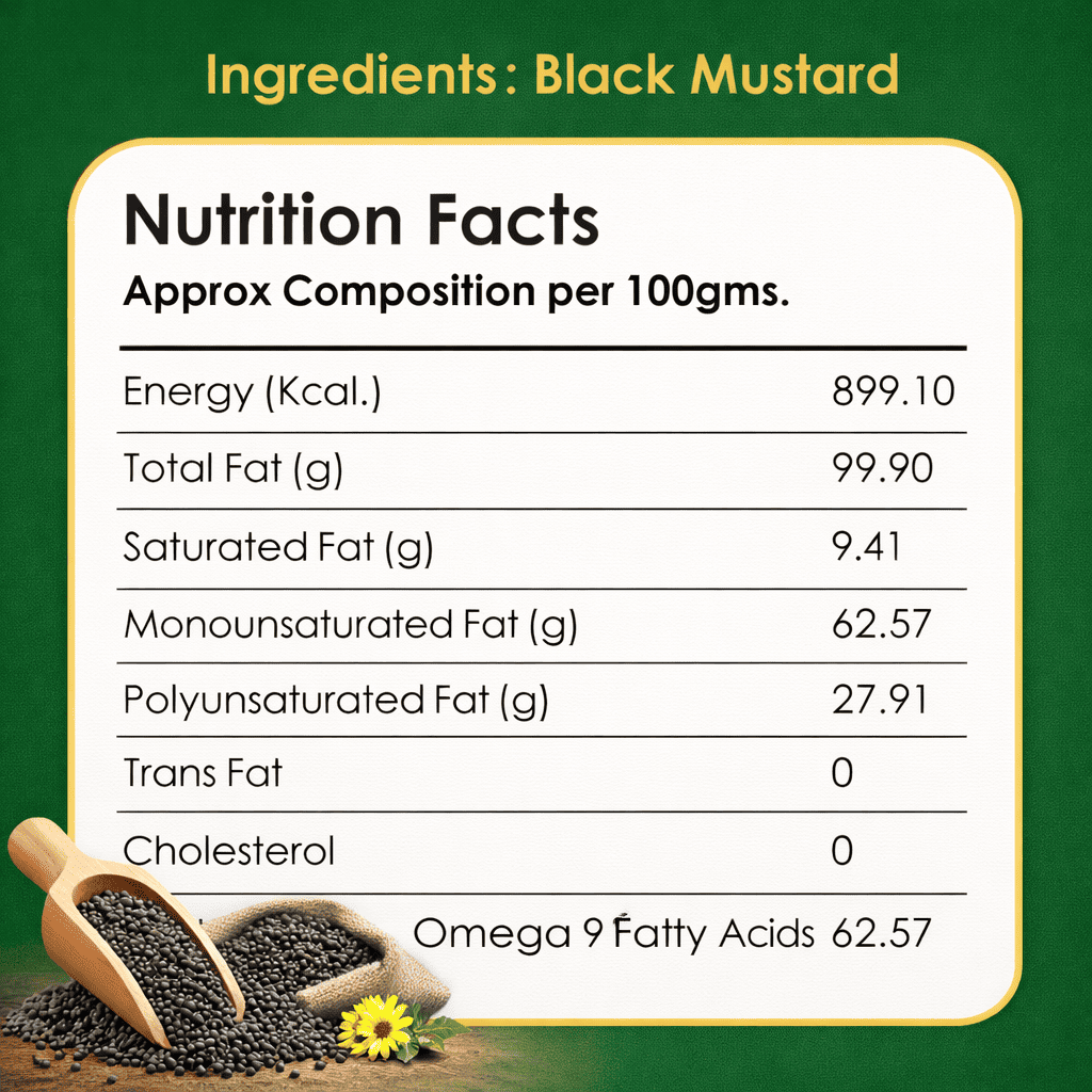 A bold and pungent oil extracted from organically grown black mustard seeds using cold-pressed methods. It retains natural aroma, nutrients, and healing properties. Ideal for traditional Indian cooking and therapeutic massages. Rich in antioxidants and Omega-3 fatty acids, it enhances immunity and supports heart health.